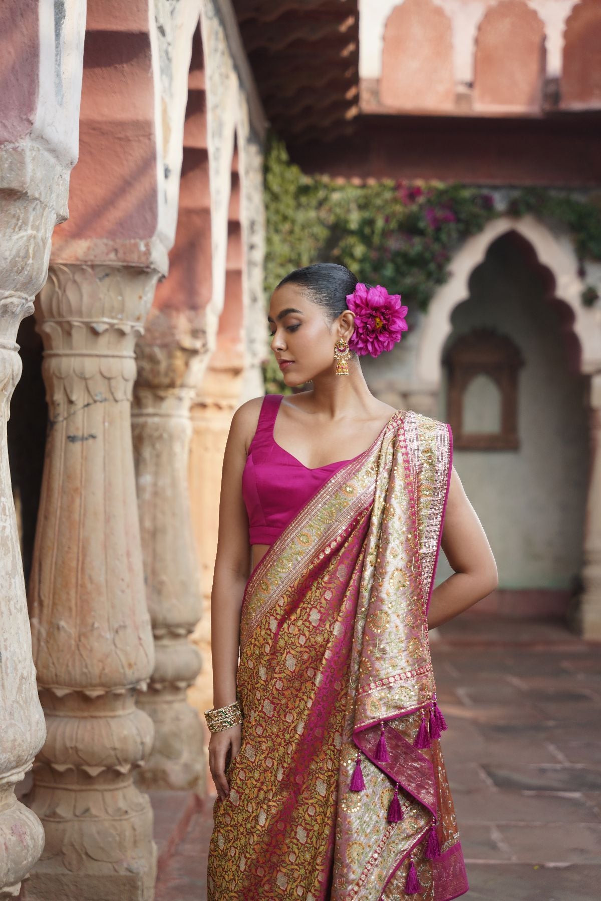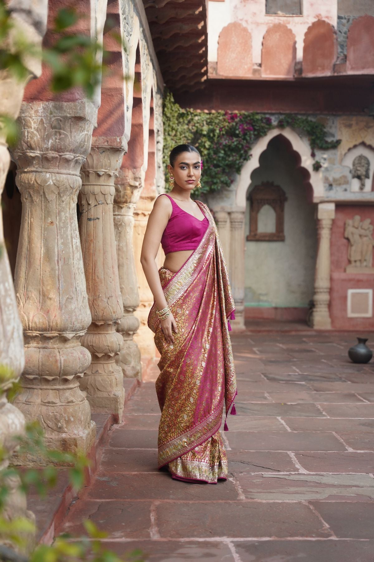 Crafted by skilled hands and patient artistry,"Meha" saree is designed to mirror the gleam of celebrations. This saree is made from Benarasi silk and is elevated in our signature gota patti, cord, zardozi & sequins.